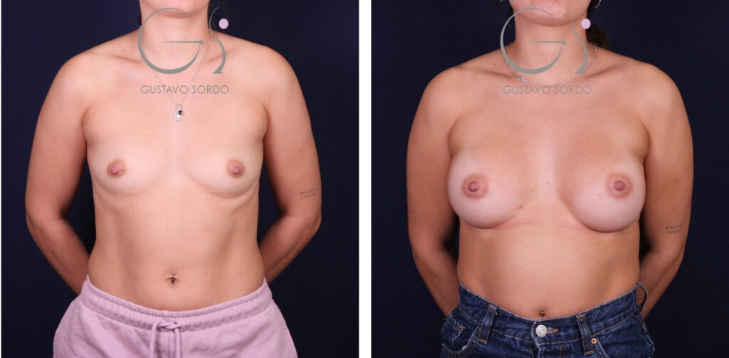 El tamaño de 255 cc generalmente aporta un aumento natural, aproximadamente de una a una talla y media de sujetador, aunque el resultado exacto puede variar según la contextura corporal y la cantidad de tejido mamario previo.